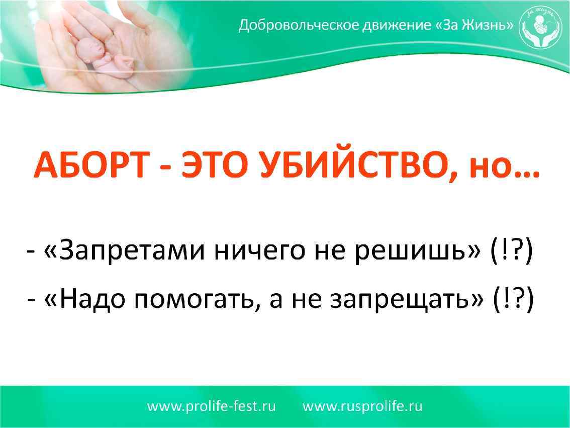 Последствия запрета абортов наш ответ (работа со страхами представителей власти) 2. Инициатива по запрету абортов является примиряющей, предлагающей путь конструктивного решения целого ряда проблем и напряженностей в обществе 2. 1. Конечно, дискуссия должна быть подготовленной, контролируемой властью и конструктивной. 2. 2. Большинство людей – здравомыслящие люди. Им не безразлично будущее нашей страны и будущее своих семей и детей. В обществе обязательно проявятся и сплотятся здоровые силы и пройдет отмежевание от «больного» , антигосударственного. 2. 3. Именно внутрисемейная война – убийство собственных детей раскалывает наше общество.