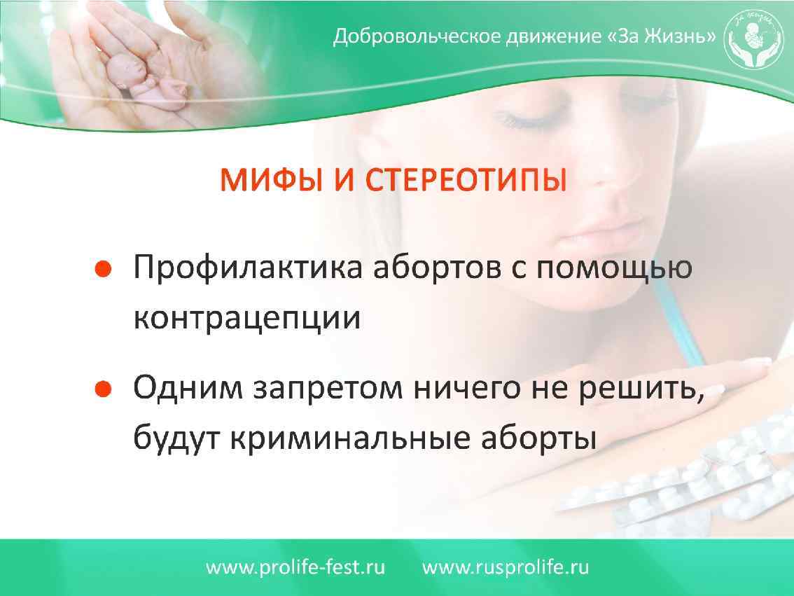 Мифы о криминальных абортах 1) сталинские репрессии за аборты 2) запрет приведет к сверхсмертности женщин 3) криминальные аборты опасны 4) запрет абортов не повысит рождаемость 5) начнутся «выездные» аборты