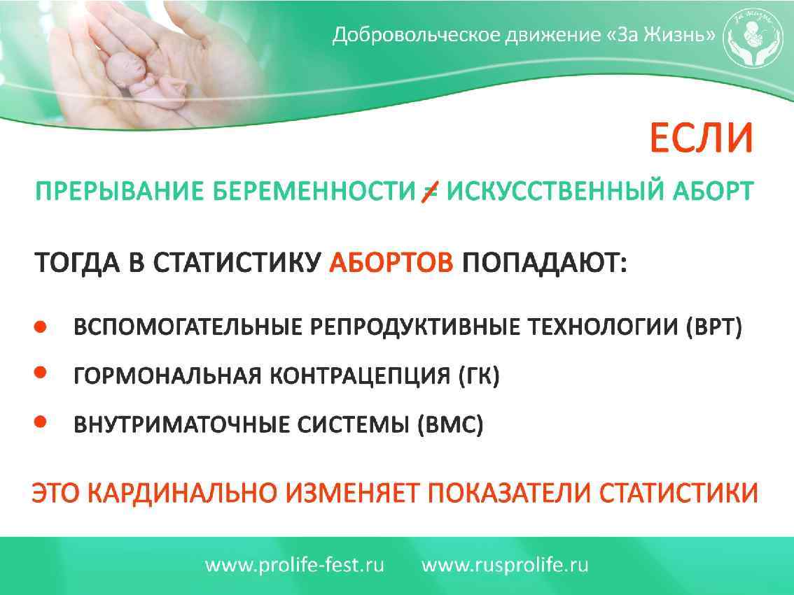 Статистика Официально по данным Росстата - 848180 (850 тыс. ) прерываний беременности в 2015 г. (см. Сведения о прерывании беременности http: //www. gks. ru/wps/wcm/connect/rosstat_main/ros stat/ru/statistics/population/healthcare/#), по экспертным оценкам с учетом не попадающих в официальную статистику прерываний негосударственных ЛПУ и в государственных "мимо медстатистики" (нарушения сроков прерывания, дней тишины и проч. ) от 3 -х до 8 -ми млн. Это не считая микроабортов в результате применения внутриматочных и гормональных средств контрацепции (используют более 9 млн женщин по данным 2011 г. ) и эмбрионов, уничтожаемых в процессе ЭКО.