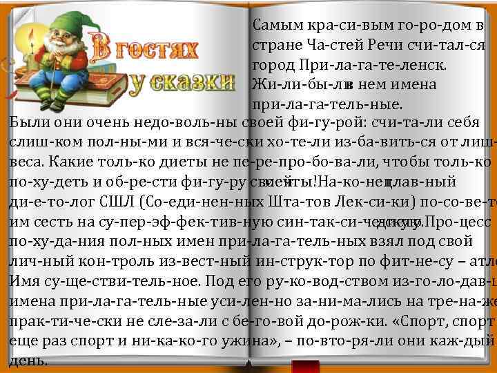 Самым кра си вым го ро дом в стране Ча стей Речи счи тал ся город При ла га те ленск. Жи ли бы ли нем имена в при ла га тель ные. Были они очень недо воль ны своей фи гу рой: счи та ли себя слиш ком пол ны ми и вся че ски хо те ли из ба вить ся от лиш веса. Какие толь ко диеты не пе ре про бо ва ли, чтобы толь ко по ху деть и об ре сти фи гу ру своей мечты!На ко нец глав ный ди е то лог СШЛ (Со еди нен ных Шта тов Лек си ки) по со ве то им сесть на су пер эф фек тив ную син так си че скую диету. Про цесс по ху да ния пол ных имен при ла га тель ных взял под свой лич ный кон троль из вест ный ин струк тор по фит не су – атле Имя су ще стви тель ное. Под его ру ко вод ством из го ло дав ш имена при ла га тель ные уси лен но за ни ма лись на тре на же прак ти че ски не сле за ли с бе го вой до рож ки. «Спорт, спорт еще раз спорт и ни ка ко го ужина» , – по вто ря ли они каж дый день.