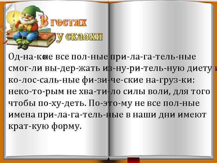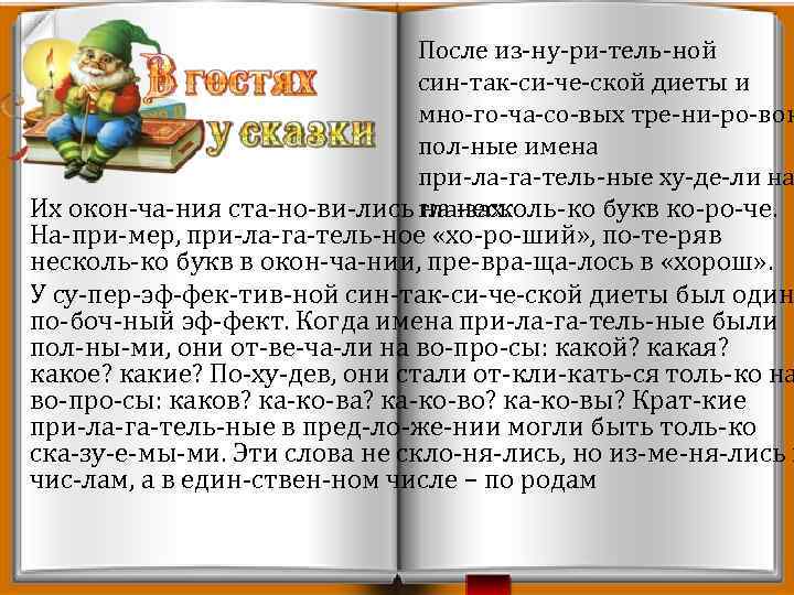 После из ну ри тель ной син так си че ской диеты и мно го ча со вых тре ни ро вок пол ные имена при ла га тель ные ху де ли на Их окон ча ния ста но ви лись гла зах. на несколь ко букв ко ро че. На при мер, при ла га тель ное «хо ро ший» , по те ряв несколь ко букв в окон ча нии, пре вра ща лось в «хорош» . У су пер эф фек тив ной син так си че ской диеты был один по боч ный эф фект. Когда имена при ла га тель ные были пол ны ми, они от ве ча ли на во про сы: какой? какая? какое? какие? По ху дев, они стали от кли кать ся толь ко на во про сы: каков? ка ко ва? ка ко во? ка ко вы? Крат кие при ла га тель ные в пред ло же нии могли быть толь ко ска зу е мы ми. Эти слова не скло ня лись, но из ме ня лись п чис лам, а в един ствен ном числе – по родам.