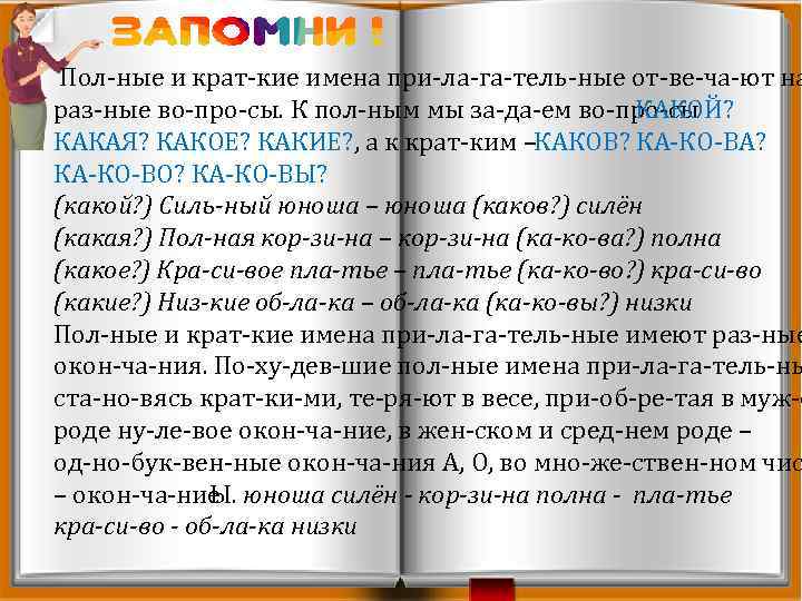 Пол ные и крат кие имена при ла га тель ные от ве ча ют на раз ные во про сы. К пол ным мы за да ем во про сы КАКОЙ? КАКАЯ? КАКОЕ? КАКИЕ? , а к крат ким –КАКОВ? КА КО ВА? КА КО ВО? КА КО ВЫ? (какой? ) Силь ный юноша – юноша (каков? ) силён (какая? ) Пол ная кор зи на – кор зи на (ка ко ва? ) полна (какое? ) Кра си вое пла тье – пла тье (ка ко во? ) кра си во (какие? ) Низ кие об ла ка – об ла ка (ка ко вы? ) низки Пол ные и крат кие имена при ла га тель ные имеют раз ные окон ча ния. По ху дев шие пол ные имена при ла га тель ны ста но вясь крат ки ми, те ря ют в весе, при об ре тая в муж с роде ну ле вое окон ча ние, в жен ском и сред нем роде – од но бук вен ные окон ча ния А, О, во мно же ствен ном чис – окон ча ние юноша силён кор зи на полна пла тье Ы. кра си во об ла ка низки