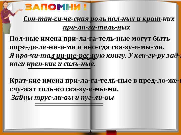 Син так си че ская роль пол ных и крат ких при ла га тель ных Пол ные имена при ла га тель ные могут быть опре де ле ни я ми и ино гда ска зу е мы ми. Я про чи тал ин те рес ную книгу. У кен гу ру зад н ~~ ~~силь ные. ноги креп кие и Крат кие имена при ла га тель ные в пред ло же н слу жат толь ко ска зу е мы ми. Зайцы трус ли вы и пуг ли вы