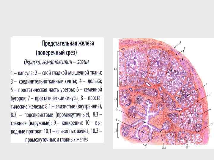 Строение семенника • • • 1 -белочная оболочка 2 -средостение 3 -с-т перегородки 4 -извитые семенные канальцы 5 -прямые канальцы 6 -канальцы сети 7 -выносящие канальцы 8 -проток придатка 9 -семявыносящий проток