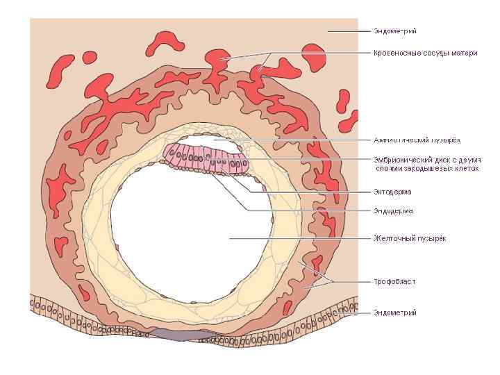 4 -ая неделя После окончательного закрепления в стенке матки, плодное яйцо продолжает расти, входящие в его состав клетки начинают не просто делиться, но и дифференцироваться по строению и функциям. Формируются зародышевые листки – энтодерма, мезодерма и эктодерма. В это время формируются и так называемые внезародышевые органы – хорион, которые впоследствии превратится в плаценту, амнион и желточный мешок, которые станут плодными оболочками.