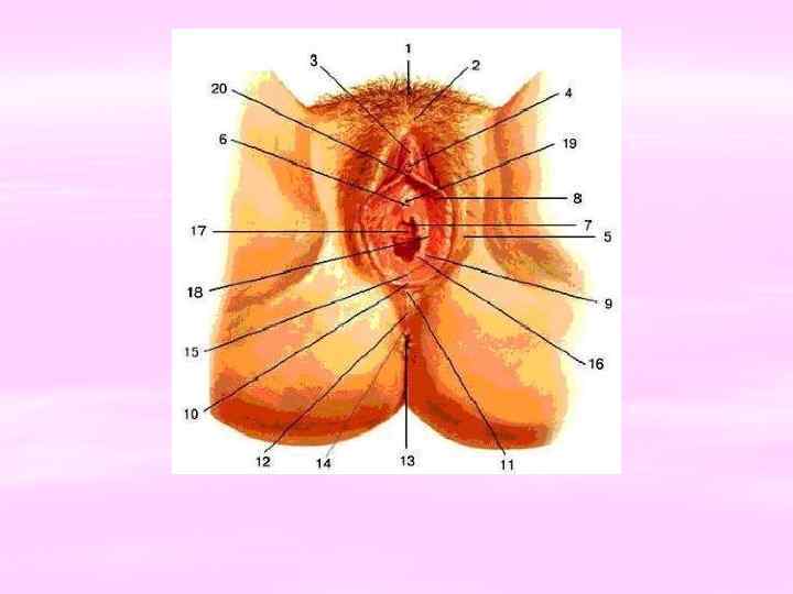 Наружные женские половые органы § Лобок (monspubis) - самый нижний участок брюшной стенки, покрытый волосистым покровом. Лобок покрывает лобковое сочленение, подкожная клетчатка этой области очень выражена, выполняет буферную защитную функцию. С боков лобок ограничен паховыми складками. § Большие половые губы - (labia majora pudendi) — парные кожные складки, ограничивающие половую щель. Снаружи покрыты волосами, пигментированы, подкожный жировой слой сильно выражен, имеются потовые и сальные железы. § Большие железы преддверия и бартолиновы железы — находятся в нижней трети больших половых губ, размером около фасоли. Секрет барталиновых желез имеет щелочную реакцию, белый цвет. § Малые половые губы (labia minora pudendi) — образованы складками нежной кожи, напоминающей слизистую, прикрыты большими половыми губами, находясь с внутренней их стороны. Спереди они переходят в клитор, сзади сливаются с большими половыми губами; имеют сальные железы, обильное кровоснабжение и иннервацию.