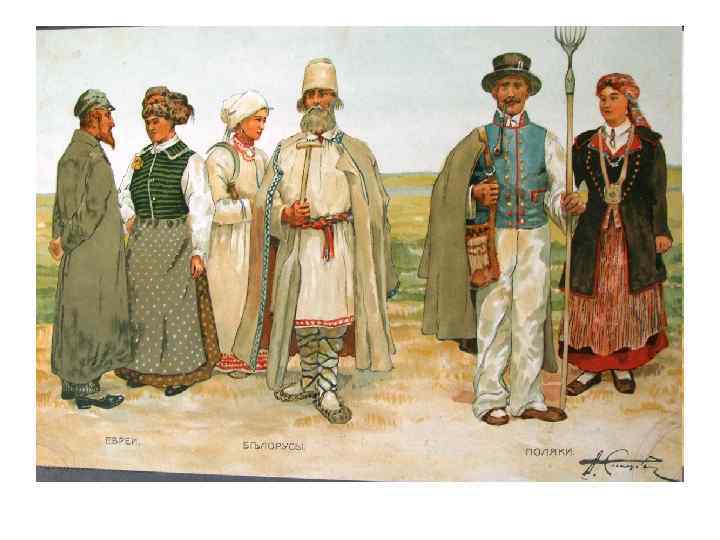 Основная территория проживания белорусов - Виленская, Витебская, Гродненская, Минская, Могилевская губернии • проживало - 6 млн. 887 тыс ( по переписи), из них белорусский назвали родным языком 73% • • Крестьяне – 92 % Дворяне – 1, 77% (более 50% назвали себя белорусами) Мещане – 5, 73% Православные – более 80% • Грамотность – 13, 5% грамотных • Городское население – до 50% - евреи, около 20% - русские