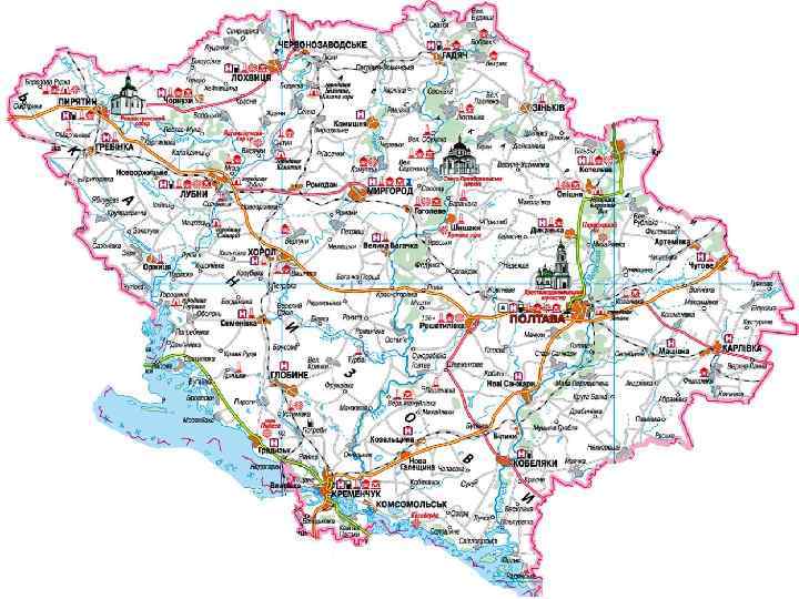 Полтавщина межує з 7 областями а саме із: v Чернігівською та Сумською на півночі; v Дніпропетровською і Кіровоградською півдні; v З Харківською областю на сході ; v Та на заході з Київською та Черкаською.