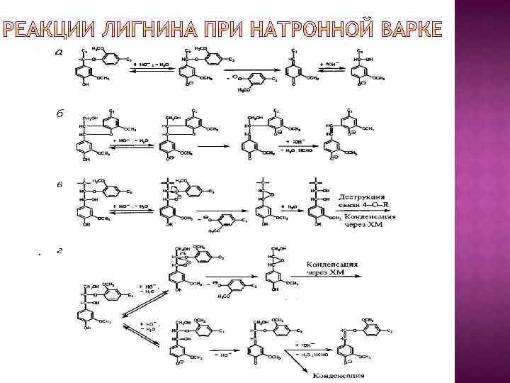 При взаимодействии Na. ОН со свободными фенольными гидроксилами лигнина образуются феноляты и лигнин переходит в отработанный варочный раствор (черный щелок) в виде фенолятов Из черного щелока можно осадить щелочной лигнин (натронный или сульфатный) подкислением минеральной кислотой (НСl, Н 2 SО 4) и даже слабой угольной кислотой. Под действием Na. ОН в лигнине расщепляются связи С О С алкил О арил, алкил О алкил и алкил О углевод с образованием растворимых фрагментов лигнина с новыми свободными фенольными гидроксилами. Связи арил О арил устойчивы. В растворе происходит дальнейшая деструкция фрагментов сетки до низкомолекулярных продуктов, не осаждаемых при подкислении. Образуется «водорастворимый лигнин» , составляющий до 25% всего лигнина.