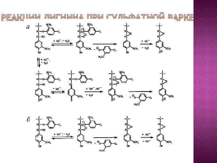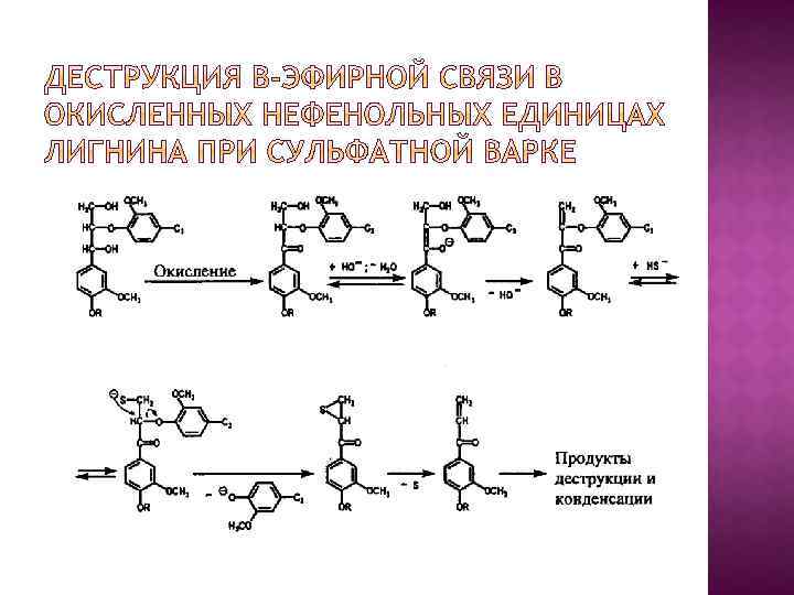 Сульфит- и гидросульфит-ионы более сильные нуклеофилы, чем гидратированный диоксид серы, поэтому в нейтральной и щелочной средах происходит частичная деструкция и метиларильных простых эфирных связей с выделением метансульфокислоты(б) В кислой среде в фенилкумарановых структурах расщепляются только связи α-О-4 с сохранением углеродной связи β-5. В нейтральной и щелочной средах связи α-О-4 расщепляются только в фенольных фенилкумарановых структурах, и образующийся хинонметид либо сульфируется, либо превращается в устойчивую стильбеновую структуру, т. е. деструкции сетки лигнина не происходит.