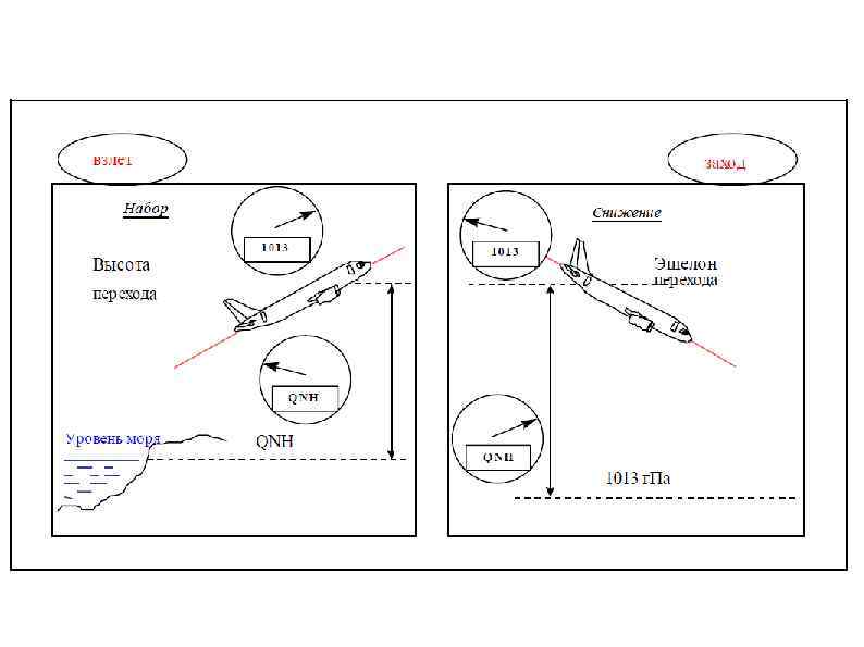 Термины и определения Эшелон полета – приборная высота в футах, деленная на 100, при условии, что установлено стандартное давление Высота перехода – приборная высота, выше которой экипажем должно быть установлено стандартное давление Эшелон перехода – первый располагаемый эшелон полета выше высоты перехода Переходный слой – участок воздушного пространства между высотой и эшелоном перехода