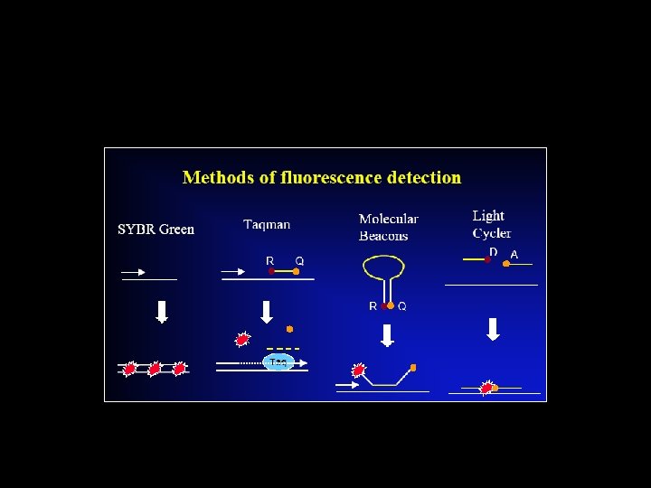 Real Time Principles Three general methods for the quantitative detection: 1. Hydrolysis probes (Taq. Man, Beacons, Scorpions) 2. Hybridization probes (Light Cycler) 3. DNA binding agents (SYBR Green)