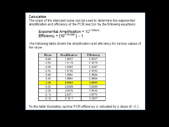 Efficiency The slope of the log linear phase is a reflection of the amplification efficiency The efficiency of the reaction can be calculated by the following equation: Eff=10( 1/slope) – 1. The efficiency of the PCR should be 90 100% (ideal slope = 3. 3) A number of variables can affect the efficiency of the PCR. These factors can include length of the amplicon, secondary structure, and primer design, to name a few Approximation vs Pfaffl method (Efficiency Determination)