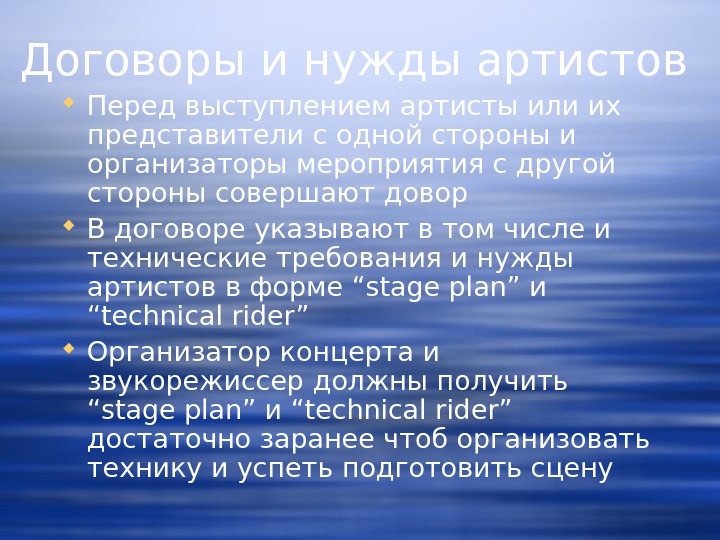 Договоры и нужды артистов Перед выступлением артисты или их представители с одной стороны и организаторы мероприятия с другой стороны совершают довор В договоре указывают в том числе и технические требования и нужды артистов в форме “stage plan” и “technical rider” Организатор концерта и звукорежиссер должны получить “stage plan” и “technical rider” достаточно заранее чтоб организовать технику и успеть подготовить сцену