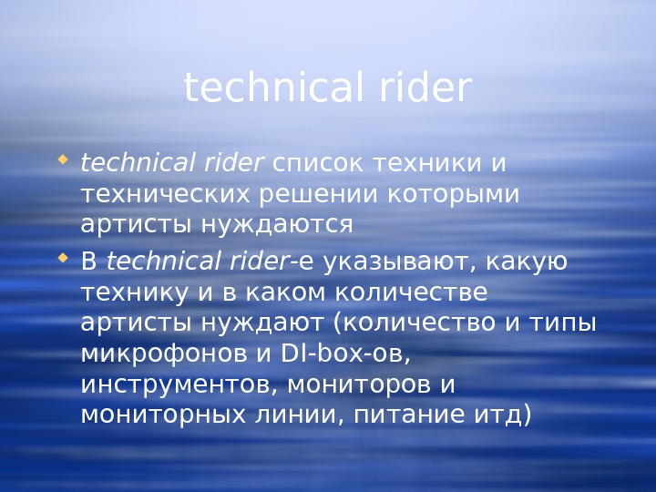 technical rider список техники и технических решении которыми артисты нуждаются В technical rider -е указывают, какую технику и в каком количестве артисты нуждают (количество и типы микрофонов и DI-box-ов, инструментов, мониторов и мониторных линии, питание итд)