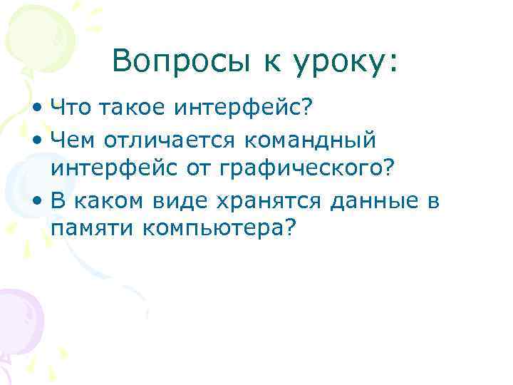 Вопросы к уроку: • Что такое интерфейс? • Чем отличается командный интерфейс от графического? • В каком виде хранятся данные в памяти компьютера?