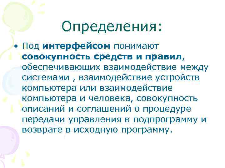 Определения: • Под интерфейсом понимают совокупность средств и правил, обеспечивающих взаимодействие между системами , взаимодействие устройств компьютера или взаимодействие компьютера и человека, совокупность описаний и соглашений о процедуре передачи управления в подпрограмму и возврате в исходную программу.