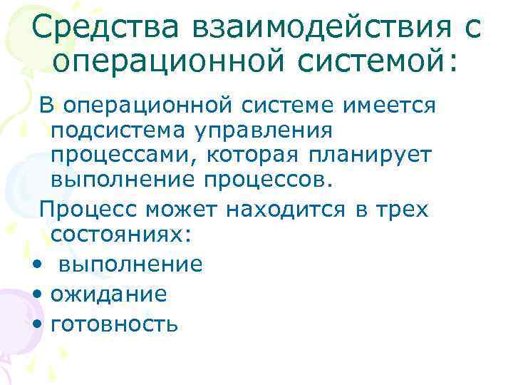 Средства взаимодействия с операционной системой: В операционной системе имеется подсистема управления процессами, которая планирует выполнение процессов. Процесс может находится в трех состояниях: • выполнение • ожидание • готовность