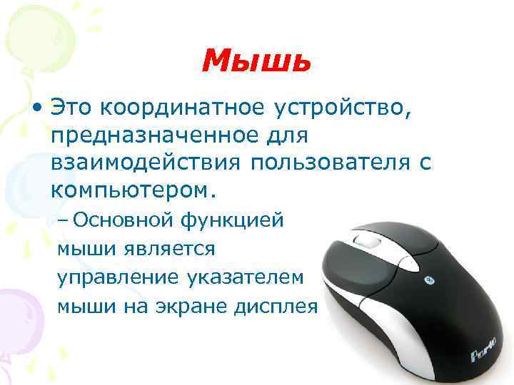 Мышь • Это координатное устройство, предназначенное для взаимодействия пользователя с компьютером. – Основной функцией мыши является управление указателем мыши на экране дисплея.