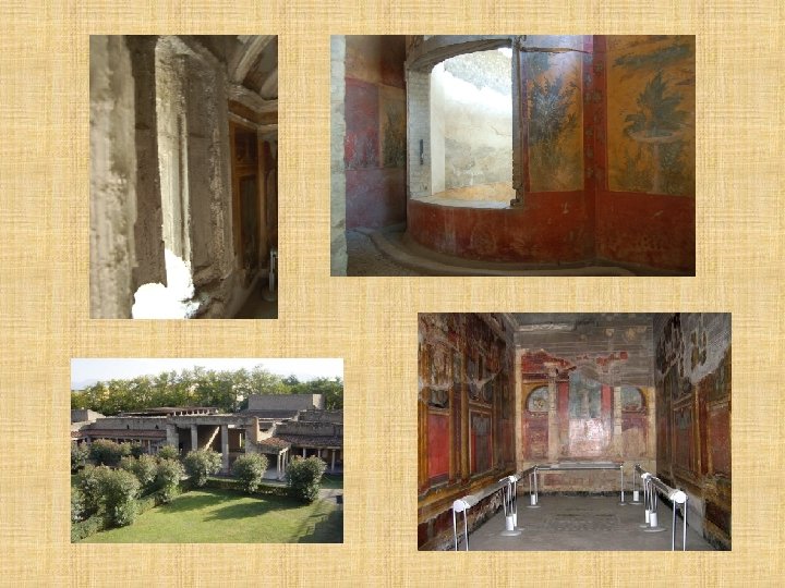 The Original House • The original house was the main residential area. At its centre was the atrium, the traditional roman reception room. The atrium of the villa Poppaea had the usual roof top opening, the conpluvium which allowed rainwater to be collected in a central pool, the impluvium, which was once the household’s main water supply. • The main function of the atrium of the Villa Poppaea was to impress. A vast room, it contained 2 nd style murals, which incorporated landscapes and mythological scenes as well as columns and porticos which increase the scale of the room. Immediately opposite the entrance would have been a series of folding doors which opened up to overlook a small peristyle garden. The rest of the original house was constructed around the atrium. The rooms immediately surrounding it were lavishly decorated and designed to be seen.