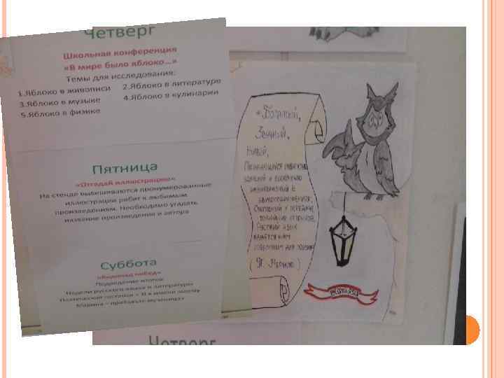 ПЯТНИЦА 24. 11. 2017 «ОТГАДАЙ ИЛЛЮСТРАЦИЮ» НА СТЕНДЕ ВЫВЕШИВАЮТСЯ ПРОНУМЕРОВАННЫЕ ИЛЛЮСТРАЦИИ РЕБЯТ К ЛЮБИМЫМ ПРОИЗВЕДЕНИЯМ. НЕОБХОДИМО УГАДАТЬ НАЗВАНИЕ ПРОИЗВЕДЕНИЯ И АВТОРА.