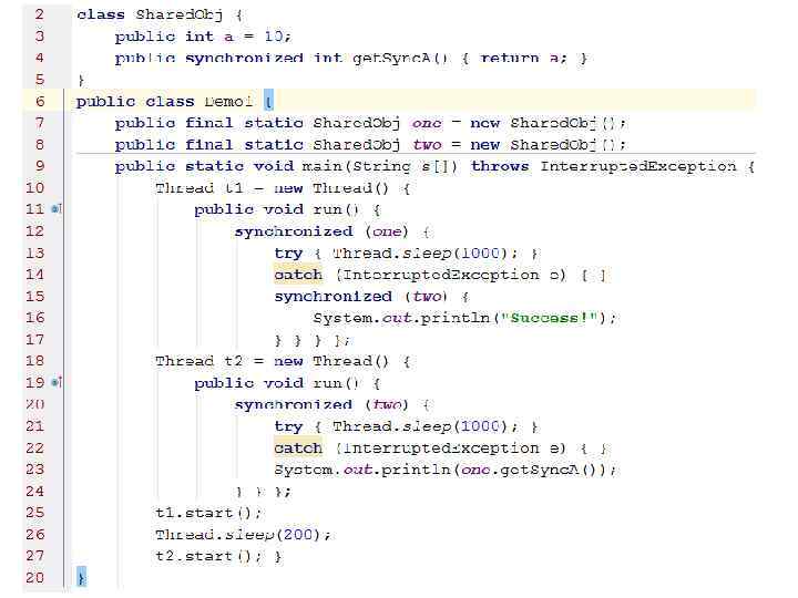 Когда я читаю многопоточный код… public synchronized int get. Sync. A() { … Thread t 1 = new Thread() { public void run() { synchronized (one) { try { Thread. sleep(1000); } catch (Interrupted. Exception e) { … t 1. start(); Thread. sleep(200); t 2. start();