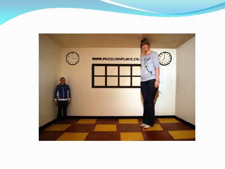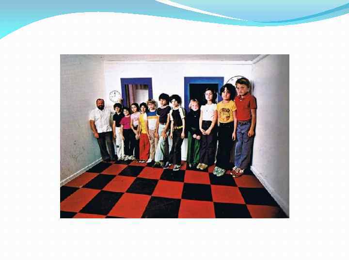 Однако благодаря ложной перспективе, созданной узорами па стенах, комната кажется прямоугольной, т. е. вызывает такое же изображение на сетчатке наблюдателя, находящегося у входной двери напротив скошенной стены, как и обычная комната. Если в дальний (скошенный) острый угол такой комнаты поставить предмет или незнакомого человека, они будут казаться уменьшенными в размере за счет уменьшения видимого расстояния до них. Однако если человек хорошо знаком или если наблюдателю дается возможность совершить некоторое действие в данной комнате (дотронуться палкой до стены, бросить мяч в противоположную стену) или даже пронаблюдать совершение действий другим человеком, то иллюзия исчезает, комната начинает видеться в соответствии с ее реальной формой. Именно практическое действие осуществляет проверку адекватности наших вероятностных предположений об истинных значениях воспринимаемого и обеспечивает коррекцию сшибок.