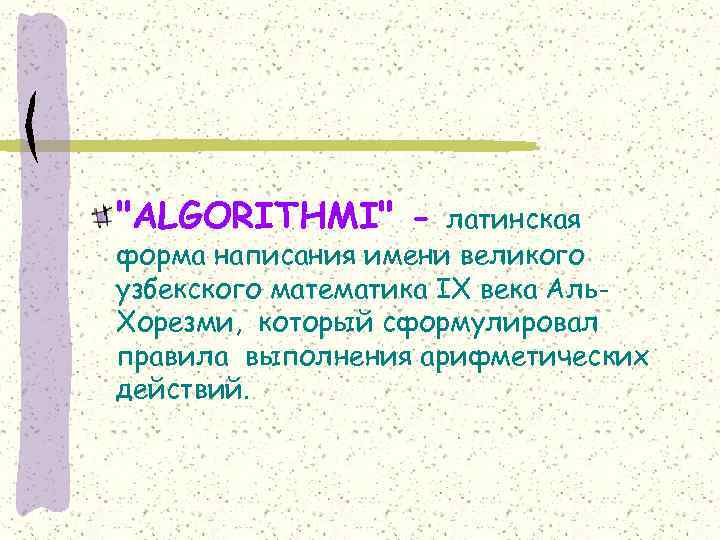 "ALGORITHMI" - латинская форма написания имени великого узбекского математика IХ века Аль. Хорезми, который сформулировал правила выполнения арифметических действий.