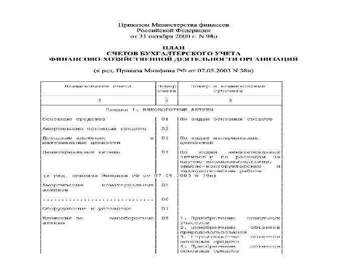 ПЛАН СЧЕТОВ 8. План счетов – систематизированный перечень синтетических счетов бухгалтерского учета. В системе нормативного регулирования бухгалтерского учет. План счетов не носит нормативно-правовой характер, т. к. принципы, правила и способы ведения бухгалтерского учета устанавливаются положениями и другими нормативными актами. Новый План счетов, принятый в 2000 году, уточняет отдельные аспекты отражения операций на счетах и приближает это отражение к требованиям международных стандартов. Сравнительная структура Планов счетов План счетов 1991 г. Код раздел а План счетов 2001 г. Наименование раздела I Основные средства долгосрочные вложения II и Код раздела другие Наименование раздела I Внеоборотные активы Производственные запасы III Затраты на производство IV Готовая продукция, реализация IV Готовая продукция и товары V Денежные средства VI Расчеты VII Капитал и резервы VII Капитал VIII Финансовые результаты использование прибыли VIII Финансовые результаты XI Кредиты и финансирование товары и и