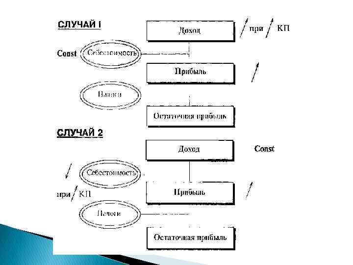 1. Влияние качества на прибыль Рассмотрим влияние качества на прибыль изготовителя продукции. Например, в Рекомендациях по применению ГОСТ 40. 9001 -88 (ИСО 9001 -87) и т. д. , это иллюстрируется схемой, где в себестоимость включены затраты изготовителя по эксплуатации продукции в гарантийный период и амортизационные отчисления перечислены в остаточную прибыль. При этом берутся в рассмотрение два случая: 1) улучшение качества продукции ведет к увеличению дохода (выручки) и прибыли при неизменной себестоимости за счет рас ширения сбыта и увеличения объема продаж; 2) увеличение прибыли возможно за счет снижения себестои мости при неизменном доходе.