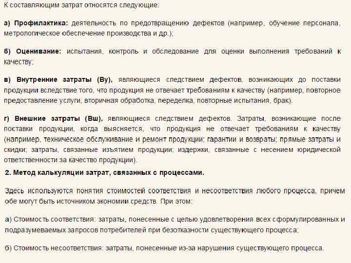 2. Классификация затрат на качество В Международных стандартах на системы качества отмечается, что затраты, связанные с качеством классифицируются внутри организации согласно ее собственным критериям. При этом к затратам, связанным с качеством относят затраты, возникающие при обеспечении и гарантировании удовлетворительного качества, в тч при совершенствовании качества, а так же связанные с потерями. Эффективная система качества может оказывать большое влияние на рентабельность организации.