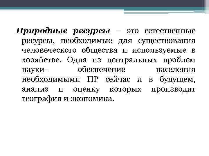Природные ресурсы – это естественные ресурсы, необходимые для существования человеческого общества и используемые в хозяйстве. Одна из центральных проблем науки- обеспечение населения необходимыми ПР сейчас и в будущем, анализ и оценку которых производят география и экономика.