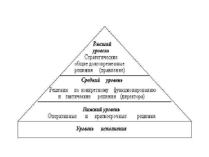 Градация уровней обычно принимается такая: руководители низового звена; руководители среднего звена; руководители высшего звена.