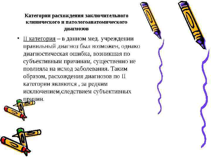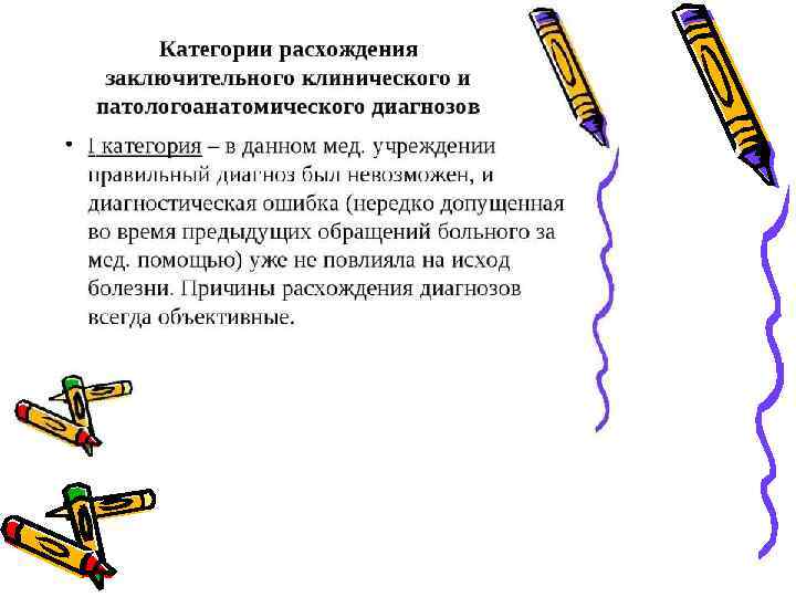 Расхождение диагнозов устанавливается в случаях если: 1) неправильно диагностирована нозологическая форма основного заболевания, его этиология или локализация; 2) не распознано одно из заболеваний, составляющее основное комбинированное заболевание; 3) основное заболевание записано в клиническом диагнозе в разделе «сопутствующие заболевания» , в связи с чем основные лечебные мероприятия были направлены на лечение другого заболевания, ошибочно трактовавшегося как основное заболевание; 4) заключительный клинический диагноз установлен посмертно, а не в процессе обследования и лечения больного.