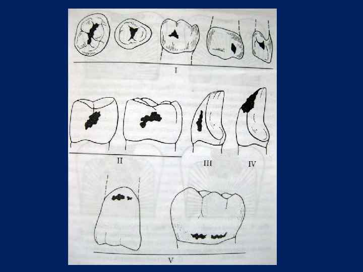 Классификация кариозных полостей Блэка: • 1 -ый класс- полости, расположенные в фиссурах и ямках жевательной, щечной и язычной прверхностей моляров и премоляров, и небной поверхности резцов верхней челюсти(реже язычной поверхности резцов нижней челюсти) • 2 -ой класс- полости, расположенные на апроксимальных поверхностях моляров и премоляров. • 3 -ий класс- полости, расположенные на апроксимальных поверхностях резцов и клыков, без нарушения целостности угла коронки и режущего края • 4 -ый класс- полости, расположенные на апроксимальных поверхностях резцов и клыков с нарушением целостности угла коронки и режущего края • 5 -ый класс- полости, расположенные в области шеек всех групп зубов.