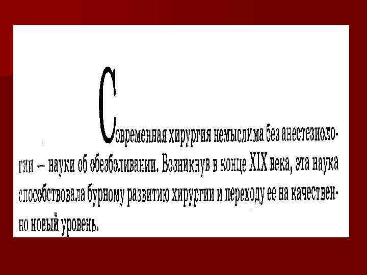 Мононаркоз – использования одного анестетика n Смешанный наркоз – одновременное использование нескольких анестетиков n Комбинированный наркоз – использование на разных этапах операции различных анестетиков или сочетание наркотиков с веществами избирательно действующими на некоторые функции организма. n
