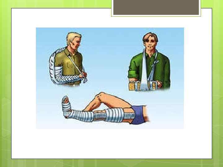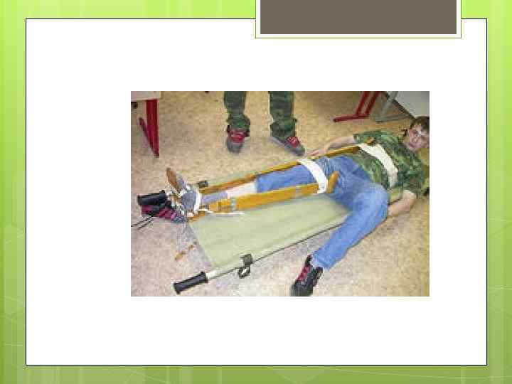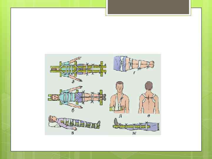 Накладывайте шину на кость так, чтобы она перекрывала суставы выше и ниже места травмы Накладывая шину на сустав, захватывайте сустав выше и ниже места травмы Если возможно, накладывайте шину с обеих сторон поврежденной конечности, чтобы она не двигалась Шина может быть сделана из любых материалов, которые окажутся (а точнее не окажутся) под рукой. Например, палка, ветка, картон, доска, лыжа и т. д. Телошина: в данном случае используется неповрежденная част тела, например, сломанный палец привязывается к соседнему, сломанная нога — к здоровой. Не пытайтесь вправить сустав или сломанную кость на место!