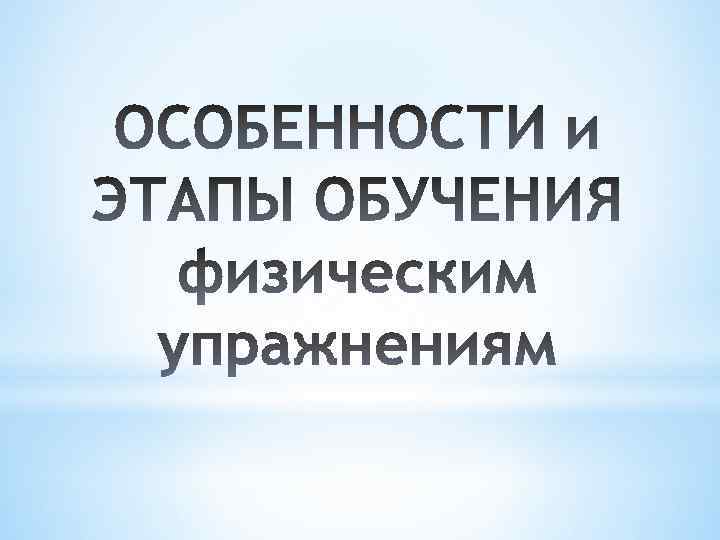 Особенности обучения в физическом воспитании: Ø учитывать работоспособность занимающихся и содействовать ее повышению Ø сформировать систему физических упражнений посредством реализации образовательной программы в контексте ФГОС Ø учитывать взаимосвязь обучения двигательным действиям с формированием знаний, развитием физических способностей и воспитанием личностных качеств Этапы обучения. 1 -ый этап обучения: этап ознакомления с двигательным действием. 2 -ой этап обучения: этап начального разучивания двигательного умения - этап формирования элементарного умения. 3 -ий этап обучения: этап закрепления приобретенного элементарного умения - этап формирования двигательного навыка. 4 -ый этап обучения: этап обучения применения навыков в различных условиях - этап формирования умения-мастерства.