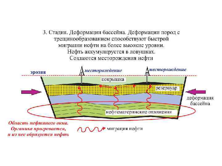 • Нефтегазоносные бассейны, связанные с развитием океанов, выделяются в соответствии со стадийностью, предложенной Дж. Вилсоном – циклы. Вилсона, охватывающие крупные периоды от распада суперконтинента и образования океана до замыкания этого океана с образованием нового суперконтинента. Цикл включает несколько стадий. Начальной является стадия, связанная с распадом суперконтинента и континентальным рифтогенезом. Подъем разогретого мантийного выступа (плюма) и утонение коры приводит к её разрыву. На ранних этапах образуются такие впадины как Красноморская, осложнённые грабеновыми структурами, с формированием в них осадочных бассейнов.