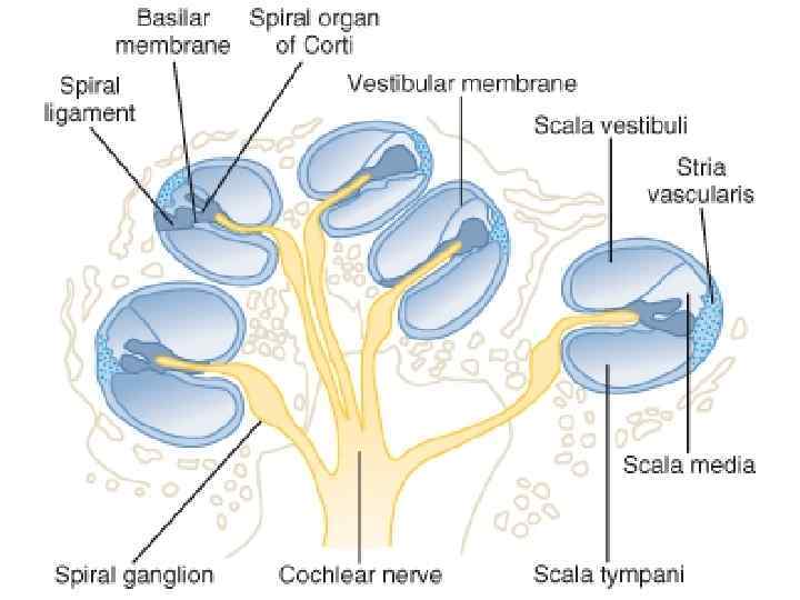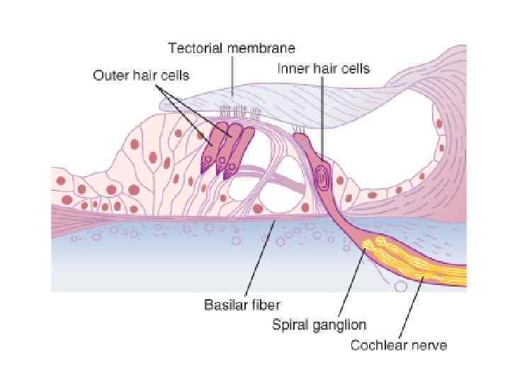 v У человека приблизительно 3500 внутренних и 12000 наружных волосковых клеток v 90% нервных волокон спирального ганглия оканчиваются на внутренних волосковых клетках, каждая из которых образует контакты с множеством из них; v остальные 10% иннервируют более многочисленные наружные волосковые клетки. Чтобы достичь всех их, эти волокна сильно ветвятся, хотя иннервируемые одним волокном рецепторы расположены поблизости друг от друга. v Всего в слуховом нерве 30000 40000 афферентных волокон. v К кортиеву органу подходят и эфференты, они могут тормозить активность афферентов.