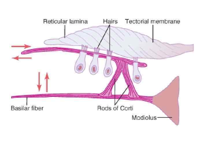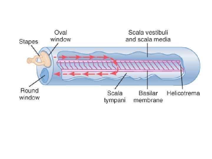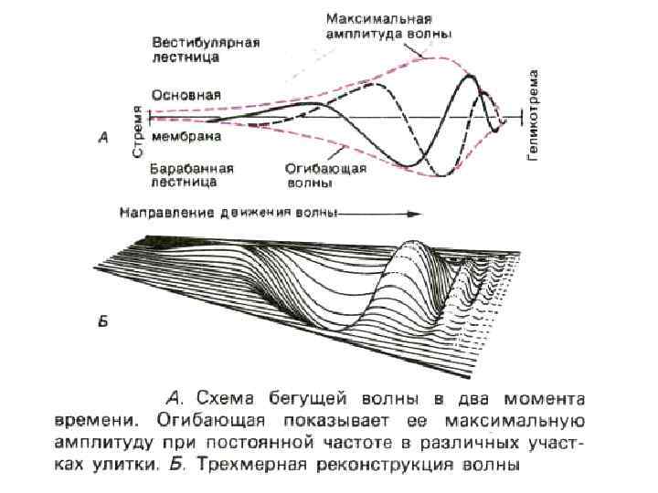 Восприятие звуков различной высоты (частоты), резонансная теория Гельмгольца v Каждое волокно основной мембраны настроено на звук определенной частоты. v Звуки низкой частоты воспринимаются длинными волнами основной мембраны, расположенными ближе к верхушке улитки v Звуки высокой частоты воспринимаются короткими волокнами основной мембраны, расположенными ближе к основанию улитки. v При действии сложного звука возникают колебания различных волокон мембраны.