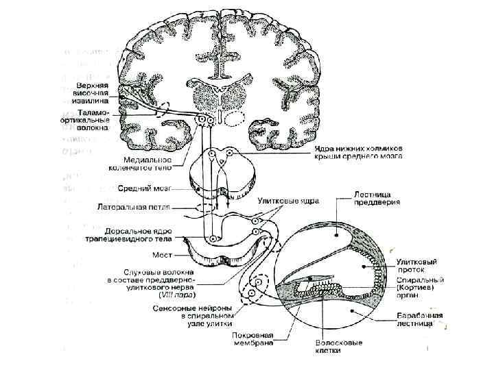 Проводниковый и корковый отделы v Слуховой тракт начинается от первичных чувствительных нейронов, которые располагаются в спиральном ганглии вблизи улитки. v Аксоны этих нейронов следуют к кохлеарным ядрам среднего мозга, где осуществляется первое синаптическое переключение. v Аксоны нейронов этих ядер направляются к ипси и контралатеральным оливарным комплексам (продолговатый мозг), что обеспечивает интегрирование сигналов от левого и правого уха на этом уровне (меньшая часть волокон остается в своем полушарии, а большая часть переходит на противоположную сторону). v Далее, после синаптического переключения в ядре латеральной петли, слуховой тракт проходит через нижние холмики четверохолмия и медиальное коленчатое тело в первичную слуховую кору (поле 41 по Бродману).