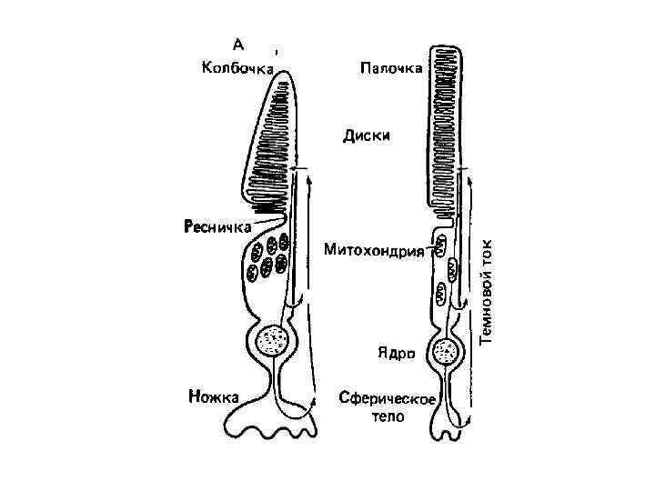 Механизм работы зрительного рецептора. v Наружные сегменты фоторецепторов (и палочек, и колбочек) содержат высокочувствительную многоступенчатую систему усиления сигнала в сетчатке. v В темноте вдоль фоторецептора из внутреннего к наружному сегменту течет т. н. темновой ток, и непрерывно идет выделение медиатора. Освещение приводит к блокаде этого тока. v В темноте происходит ресинтез (восстановление) зрительных пигментов, распавшихся во время освещения. Восстановление йодопсина происходит в 500 раз быстрее, чем родопсина. Этим объясняются различия в скорости световой и темновой адаптации зрительной системы. v Фоторецепторы связаны между собой электрическими синапсами (щелевыми контактами) (палочки с палочками, а колбочки с колбочками). Благодаря такому соединению сигнал, возникший в одном рецепторе, быстро распространяется к соседним клеткам.