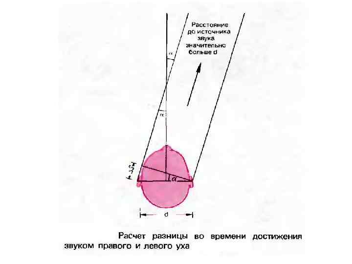 Бинауральный слух — восприятие звуков двумя ушами с соединением одновре менно получаемых ими сигналов, позволяющих локализовать источник звука в пространстве. v Эта особенность позволяет человеку использовать пространственный слух, при помощи которого можно установить место расположения источника звука, степень его удаленности и направление его перемещения, а также увеличивает четкость восприятия. v Для низких частот основным фактором бинаурального слуха являются различия во времени попадания звука в правое и левое ухо, а для высоких частот — различия в интенсивности звуков. v Если источник звука расположен точно по средней линии (спереди или сзади), то звук достигает обоих ушей одновременно, но обычно источник звука смещен, и поэтому сначала звук достигает уха, ближе расположенного к источнику звука. v Малейший сдвиг вправо или влево даже менее 3° уже воспринимается человеком. Поскольку расстояние между ушами у человека составляет примерно 17— 18 см, а голову можно рассматривать как шар с радиусом 9 см, то разница между попаданием звука в разные уши составит примерно 840 мкс.