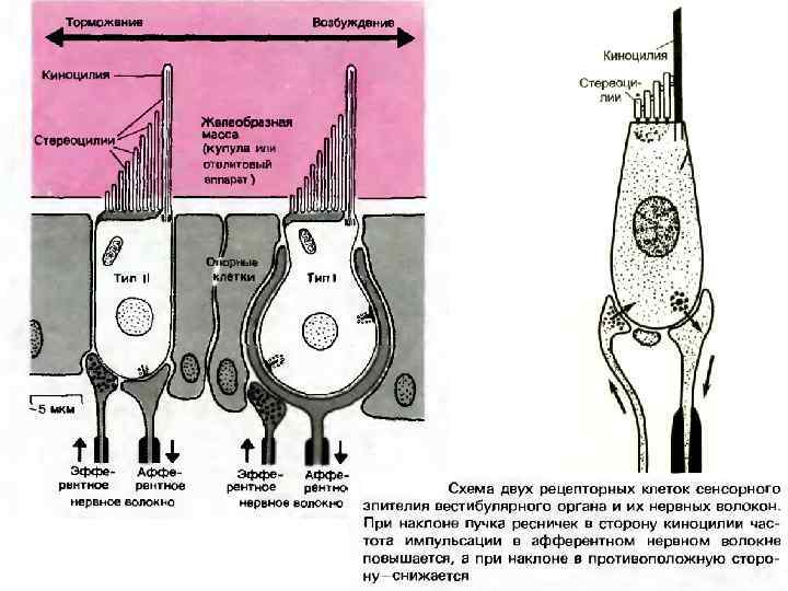 Периферический отдел v Внутри костных лабиринтов височной кости (внутреннее ухо) находятся перепончатые лабиринты, заполненные эндолимфой. v Перепончатые лабиринты состоят из двух отолитовых органов (сакулюс и утрикулюс) и трех полукружных каналов каждый, внутри которых и находятся рецепторные клетки. v Полукружные каналы расположены в трех взаимно перпендикулярных плоскостях и соединены друг с другом в полости преддверия. v Рецепторы, расположенные в отолитовых органах чувствительны к линейным ускорениям тела (при движениях вперед назад и вверх вниз), а рецепторы полукружных каналов реагируют на угловые ускорения (при круговых движениях и при вращении, при наклонах головы). v Вестибулярные рецепторы представляют собой вторичные механочувствительные волосковые клетки, имеющие на поверхности клетки специальные выросты (стереоцили и одну длинную киноцилию).