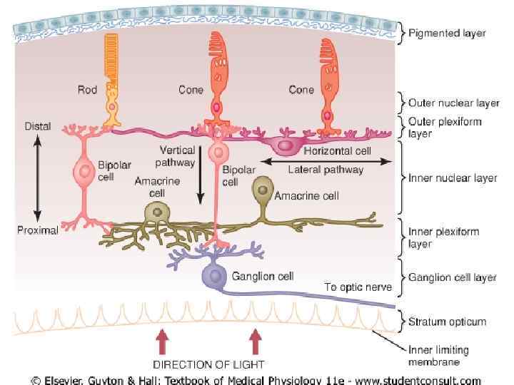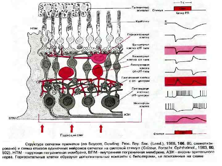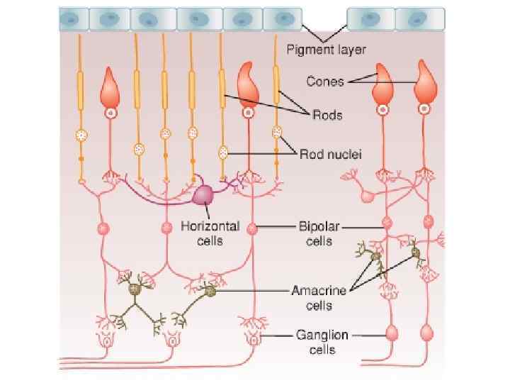 фоторецепторы — это вторичные рецепторные клетки биполярные клетки ганглиозные клетки. зрительный нерв. Горизонтальные клетки связывают фоторецепторы с биполярными клетками и могут передавать сигналы вдоль наружного синаптического слоя сетчатки. Амакриновые клетки соединяют биполярные клетки к ганглиозные. Горизонтальные и амакриновые клетки являются тормозными нейронами и обеспечивают процессы латерального торможения в сетчатке.