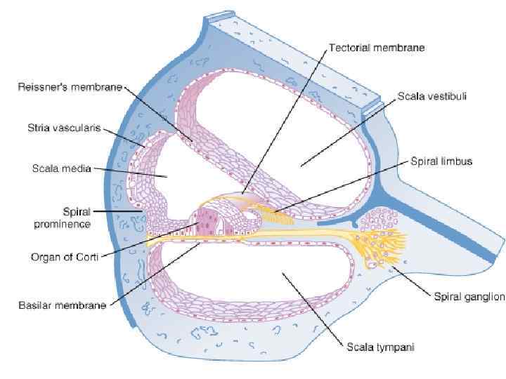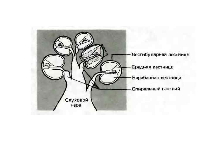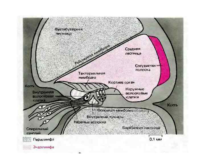 Внутреннее ухо v Состоит из улитки и перепончатого лабиринта ( вестибулярный аппарат). v Кортиев орган периферическая часть слухового анализатора располагается в спирально завитом костном канале внутреннего уха (улитке), заполненном эндолимфой. v Внутри улитки проходят две мембраны, разделяющие ее на три лестницы вестибулярную, барабанную и среднюю. v Лестницы заполнены несжимаемыми жидкостями (эндолимфой и перилимфой). v Рецепторы располагаются на базальной (основной) мембране. v Слуховые рецепторы представляют собой механочувствительные волосковые клетки с выростами стереоцилями, обращенными внутрь средней лестницы. v Волосковые клетки образую наружный и внутренний ряды. v Над кортиевым органов располагается желеобразная покровная (текториальная) мембрана. v Стереоцили внутренних волосковых клеток не имеют постоянного контакта с покровной мембраной, а стереоцили наружных волосковых клеток погружены в нее.