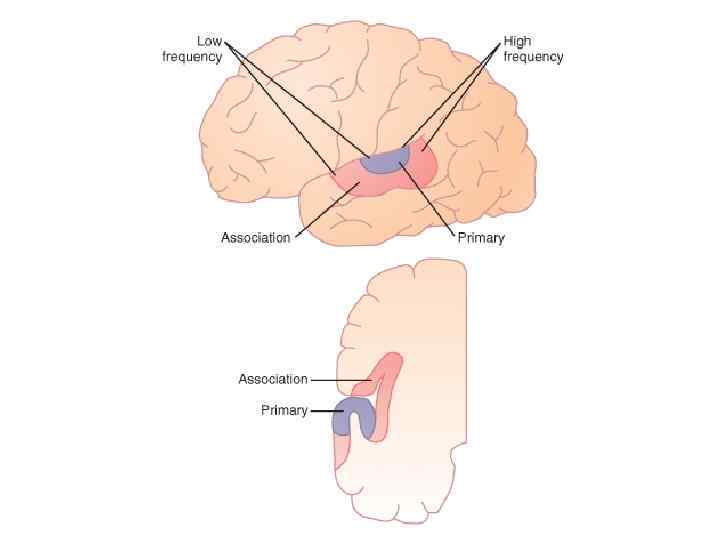 Центральный (корковый) отдел v Первичная слуховая кора расположена в поле 41 по Бродману, v В первичную слуховую кору поступает информация, предварительно обработанная в подкорковых ядрах, но сохраняющая тонотопическую организацию. В передних областях слуховой коры располагаются колонки, получающие и обрабатывающие высокочастотные звуки, а в задних областях низкочастотные. v Рецептивные поля у большинства нейронов имеют большие размеры и нечеткие границы. v в первичной коре находятся нейроны, избирательно реагирующие на отдельные признаки звукового сигнала: продолжительность, повторение, шумы и т. д. v По внутрикорковым связям нервные импульсы достигают вторичной слуховой коры (поле 42) и ассоциативной коры. v Вторичные слуховые зоны находятся в верхних отделах слуховой коры. Раздражение этих зон вызывает у человека ощущения шорохов или шумов, которые связываются с услышанными раньше звуками. v Слуховая кора у человека имеет непосредственное отношение к пониманию речи (зона Вернике).