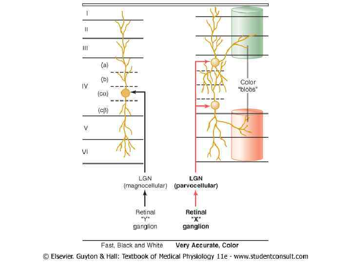 Теории цветового зрения 1. Трехкомпонентная теория Ломоносова—Юнга—Гелъмголъца— Лазарева. В сетчатке есть три типа колбочек, поглощающих свет в диапазонах с максимумами в красном, синем и зеленом цвете. Комбинация возбуждения этих трех типов колбочек приводит к ощущению различных цветов и оттенков. Равномерное возбуждение трех типов колбочек дает ощущение белого цвета Впоследствии методом микроспектрофотометрии было обнаружено, что даже одна колбочка может поглощать лучи с разной длиной волны, что связано с наличием в этих клетках разных пигментов, чувствительных к волнам света различной длины. У этой теории есть экспериментальные подтверждения, но в физиологии есть ряд явлений, которые не объясняются с этой позиции. 2. Теория оппонентных (контрастных) цветов Э. Геринга. В других клетках сетчатки и в вышележащих структурах головного мозга есть процес сы восприятия противоположных (на спектре) цветов: синий — желтый и красный — зеленый, а также черный — белый. Эта теория справедлива для