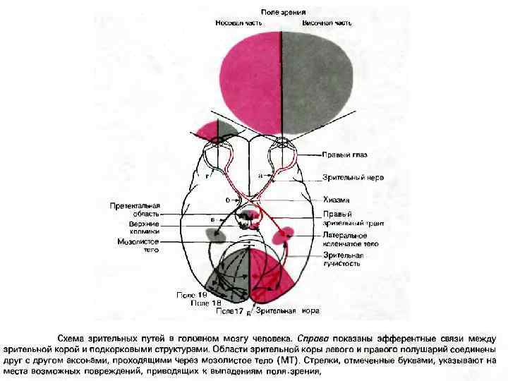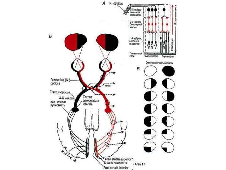 Проводниковый отдел зрительного анализатора v Зрительный нерв (от одного глаза) содержит около 800 тыс. волокон ганглиозных клеток сетчатки. v После выхода из глаза зрительные нервы от обоих глаз имеют неполный перекрест в области гипоталамуса — зрительная хиазма. v В области перекреста около 500 тыс. волокон переходит на другую сторону, а оставшиеся 300 тыс. идут в кору того же полушария. С крещенными волокнами от другого глаза они образуют зрительный тракт. Далее волокна зрительного тракта передают сигнал следующим структурам головного мозга: v ядра верхних (передних) бугров четверохолмия (средний мозг); v наружное (латеральное) коленчатое тело (таламус), а от него в поле 17 в затылочной коре; v ядра глазодвигательных нервов; v супрахиазматические ядра гипоталамуса.